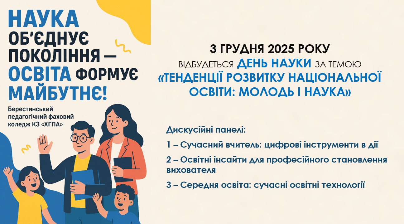 Це свято нагадує нам, що саме наука рухає людство вперед, відкриває нові горизонти знань і допомагає творити майбутнє. Наукове студентське товариство Берестинського педагогічного фахового коледжу КЗ «ХГПА» вітає всіх дослідників, викладачів і студентів, які щодня шукають істину, відкривають нові ідеї та втілюють їх у життя. Пам’ятаймо: кожен науковий пошук починається з цікавості – з бажання пізнати, зрозуміти, вдосконалити. Нехай цей день надихає нас на нові відкриття, творчі ідеї та успіхи в навчанні й науковій діяльності! Разом – до нових вершин науки, освіти та розвитку України!