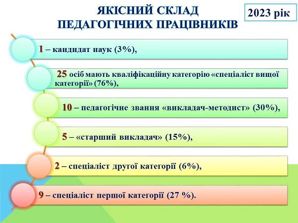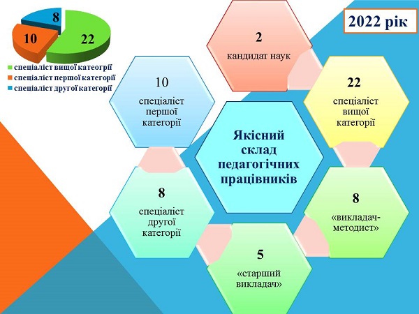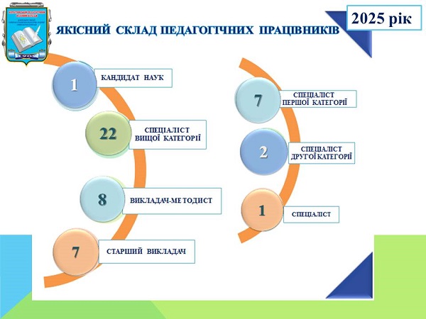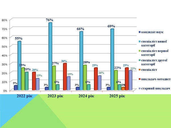 Цього року атестації підлягало 6 педагогічних працівників, 7 посад. Усі педагогічні працівники, які атестуються, мають необхідний сумарний обсяг підвищення кваліфікації впродовж п’яти років: 120 год. і більше.