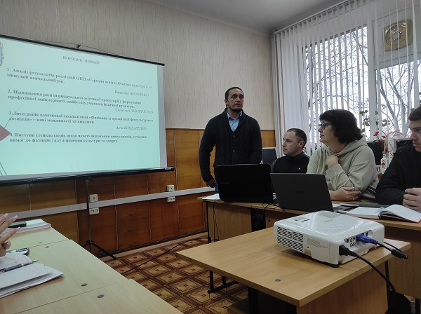 Під час зустрічі обговорювались важливі питання для забезпечення та покращення якості освітнього процесу, а саме: аналіз результатів реалізації ОПП Середня освіта (Фізична культура) за минулий навчальний рік (голова робочої групи ОПП), підвищення ролі індивідуальної освітньої траєкторії у формуванні професійної майстерності майбутніх учителів фізичної культури (викладачка Лук’янченко С.П, здобувач освіти ІІІ курсу Дебелий О.), інтеграція додаткової спеціалізації «Фахівець із організації фізкультурного дозвілля» – нові можливості та виклики (викладачка Бондаренко А.В.,вчителька закладу освіти міста Божко Л.Ю., здобувач освіти ІV курсу Чуфаров Д.), виступи стейкхолдерів щодо якості підготовки випускників, сучасних вимог до фахівців галузі фізичної культури та спорту (директори шкіл, вчителі фізичної культури міста).