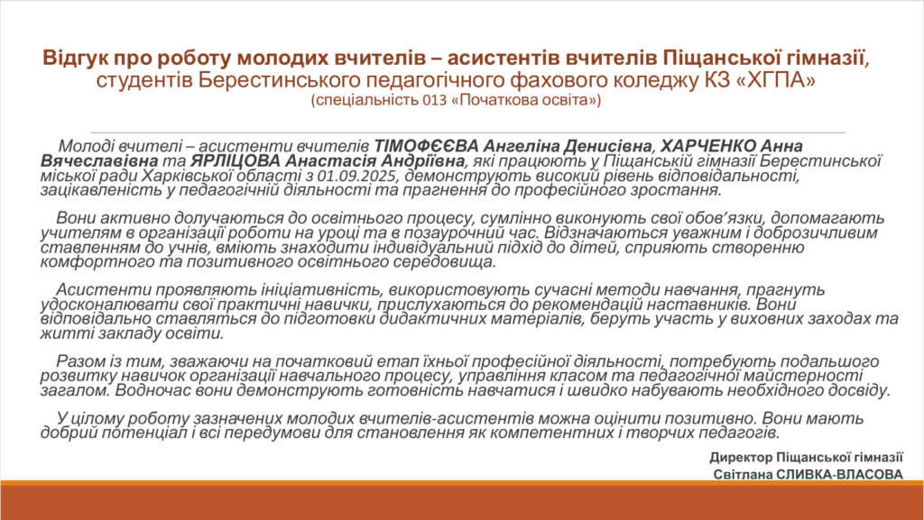 Відгук про роботу молодих вчителів – асистентів вчителів Піщанської гімназії, студентів Берестинського педагогічного фахового коледжу КЗ «ХГПА» (спеціальність 013 «Початкова освіта»)