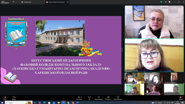 Світлана КОЛОСОВА, кандидат педагогічних наук, доцент, спеціаліст вищої категорії, старший викладач кафедри теорії та методик дошкільної освіти Комунального закладу “Харківська гуманітарно-педагогічна академія” Харківської обласної ради, у своїй доповіді звернула увагу на тісну співпрацю між Берестинським педагогічним фаховим коледжем КЗ “ХГПА” та Комунальним закладом “Харківська гуманітарно-педагогічна академія” Харківської обласної ради через проведення спільних заходів по обміну досвідом та обговорення актуальних питань дошкілля.