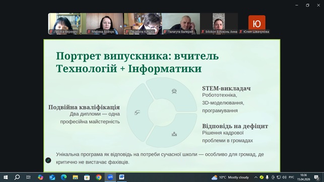 16 квітня 2026 року о 15:00 відбулася тристороння офлайн та онлайн-зустріч у форматі ZOOM-конференції, присвячена обговоренню та вдосконаленню освітньо-професійної програми «Середня освіта (Технології)» у межах підготовки до набору 2026 року.