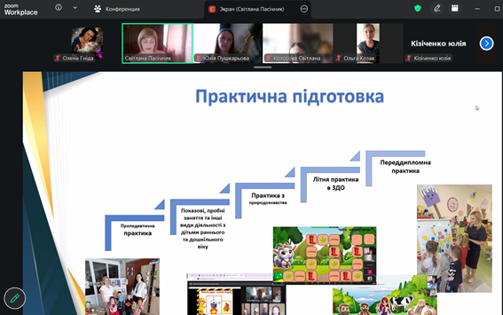 Зі вступним словом виступила Світлана ПАСІЧНИК, викладач окремих методик спеціальності Дошкільна освіта, яка познайомила присутніх із змістом та структурою освітньо-професійної програми Дошкільна освіта, висвітлила роль стейкхолдерів в освітньому процесі та ефективні шляхи взаємодії з ними.