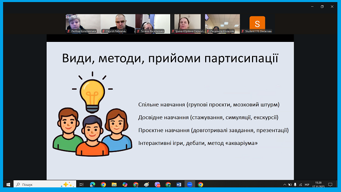 17 листопада у рамках декади спеціальності Середня освіта (Технології) відбувся семінар на тему: Реалізація партисипативної взаємодії між вчителем та учнями на уроках «Технології». Жуков В.П., доктор філософії, доцент кафедри дизайну і технологій ХНПУ імені Г.С.Сковороди акцентував увагу на характеристиці, видах, та прийомах партисипації. Учасники заходу зосередили увагу на практичному застосуванні методів партисипації під час проходження різних видів практики.