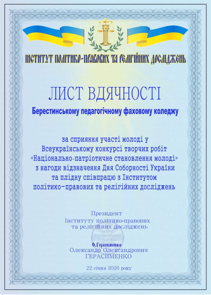 За результатами Всеукраїнського конкурсу творчих робіт «Національно- патріотичне становлення молоді» до Дня Соборності України, який проводив Інститут політико-правових та релігійних досліджень (взяло участь 25368 учасників), всі 11 здобувачів освіти Берестинського педагогічного коледжу КЗ «ХГПА», які брали участь у написанні есе, отримали такі нагороди: Іхненко Вікторія (диплом І ступеня), Коломієць Діана, Глухенко Злата, Кучумова Вікторія, Кравченко Софія (диплом ІІ ступеня), Єрмоленко Діана, Цапенко Олександр, Івахненко Софія, Ткач Анна, Воротнікова Анастасія, Ляпота Марина (диплом ІІІ ступеня). Керівник: викладач української мови та літератури Турчина-Приходько Світлана Миколаївна. Берестинський педагогічний фаховий коледж КЗ «ХГПА» отримав офіційну подяку від організаторів конкурсу за сприяння участі української молоді у конкурсі та плідну співпрацю! Щиро вітаємо і пишаємося!!!