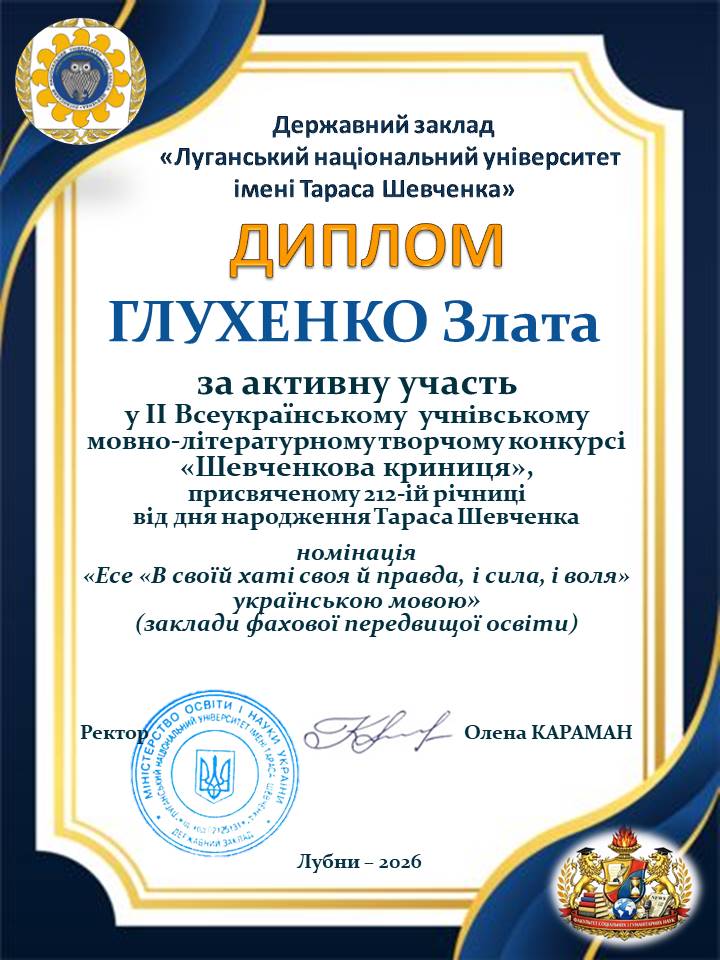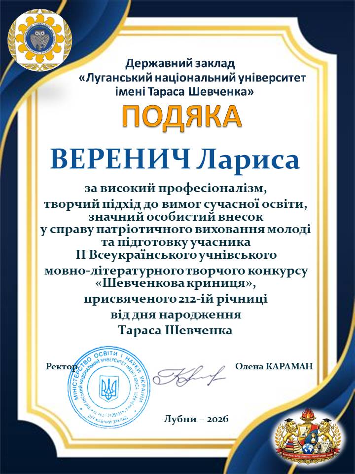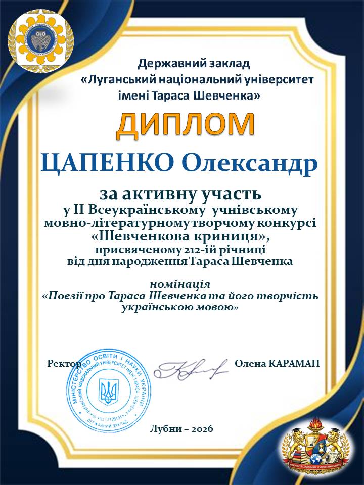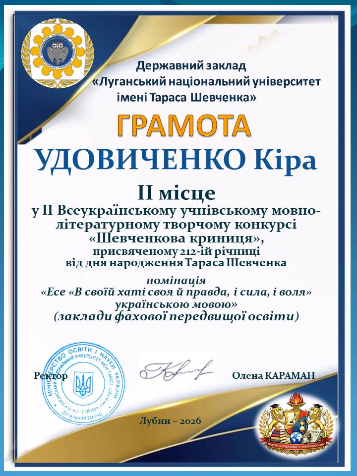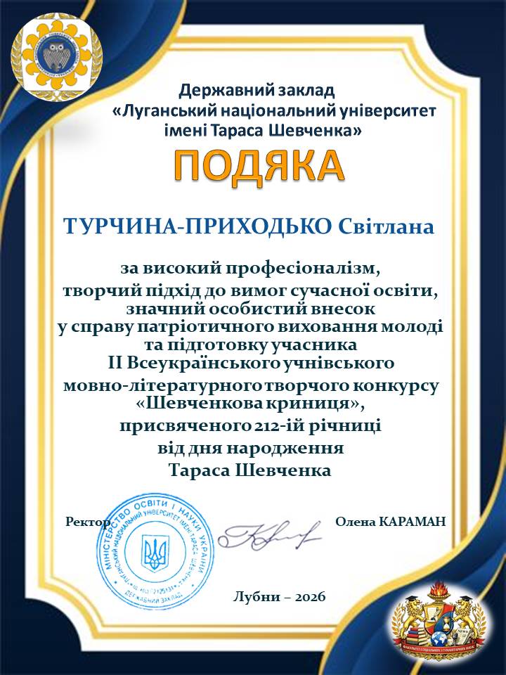 Луганський національний університет імені Тараса Шевченка сприяв проведенню ІІ Всеукраїнського мовно-літературного творчого конкурсу «Шевченкова криниця», присвяченого 212-ій річниці з дня народження Тараса Шевченка. Цьогоріч конкурс об’єднав майже 750 талановитих учнів 9–11 класів, студентів закладів фахової передвищої освіти з усіх куточків України. Конкурс вкотре довів: настанова Тараса – «В своїй хаті своя й правда, і сила, і воля» – є живим маніфестом сучасної молоді. Захід продемонстрував, що українська молодь – це покоління, яке вміє «любити свою Україну во время люте» і будувати її світле майбутнє силою думки. «Ми бачимо неймовірну глибину в конкурсних роботах на тему «В своїй хаті своя й правда, і сила, і воля», – зазначали члени журі. – Молодь сьогодні відчуває ці слова не як цитату з підручника, а як фундамент нашої державної незалежності». До складу журі увійшли викладачі кафедри літературознавства і східної філології, кафедри української мови і журналістики і кафедри іноземних мов.